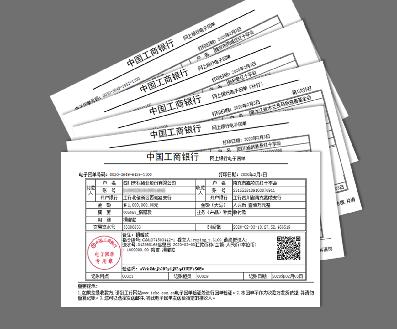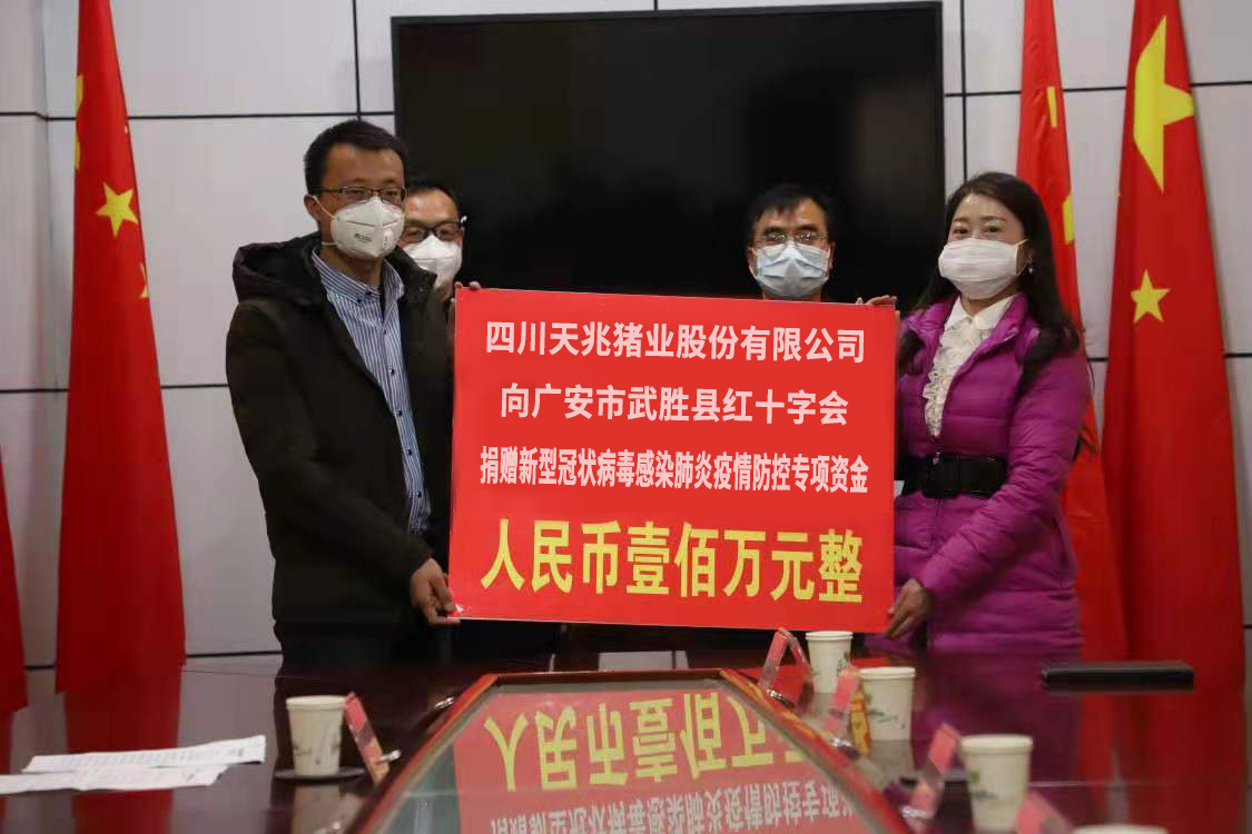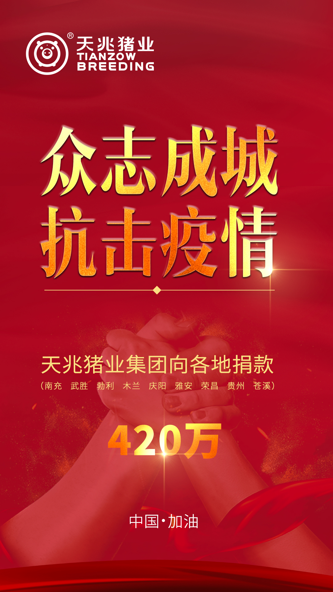 随着疫情的形势逐渐严峻,全国各地防控一线医疗物资告急。面对严峻防控形势,天兆猪业集团第一时间行动起来,截止目前,天兆猪业集团向四川南充市、武胜县、雅安市、苍溪县,重庆荣昌区,黑龙江勃利县、木兰县,甘肃庆城县、西峰区,贵州团溪镇累计捐款420万元,全力支持以上地区的新型冠状病毒疫情防控工作。