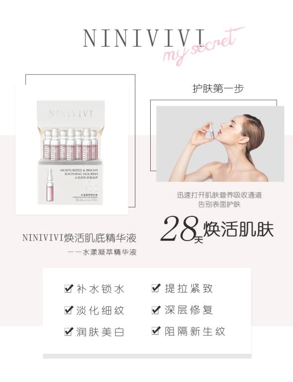 NINIVIVI是将天然萃取成分应用到护肤品中的肌底精华,内含大小分子透明质酸钠,具有很强的渗透力除了促进后续护肤吸收,还额外添加了修复功能,可以强韧皮肤,帮助抵抗外界伤害和刺激.