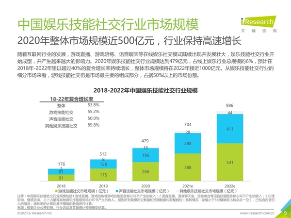 根据其在2021年发布的《中国娱乐技能社交行业研究报告》,2020年行业整体市场规模为479亿,2021年突破700亿,2020年预计将达到986亿,不出意外今年过后,国内娱乐社交行业规模将正式进军千亿“俱乐部”。