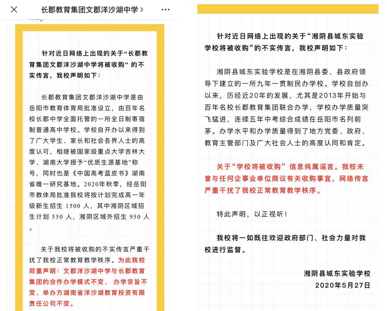 近日,针对学校将被收购传言,湘阴城东实验学校、长郡教育集团文郡洋沙湖中学相继在官方微博、官方微信发表辟谣声明,否认“学校将被收购”信息。