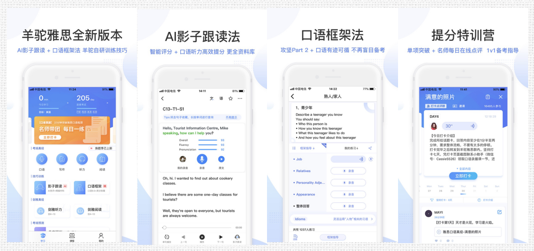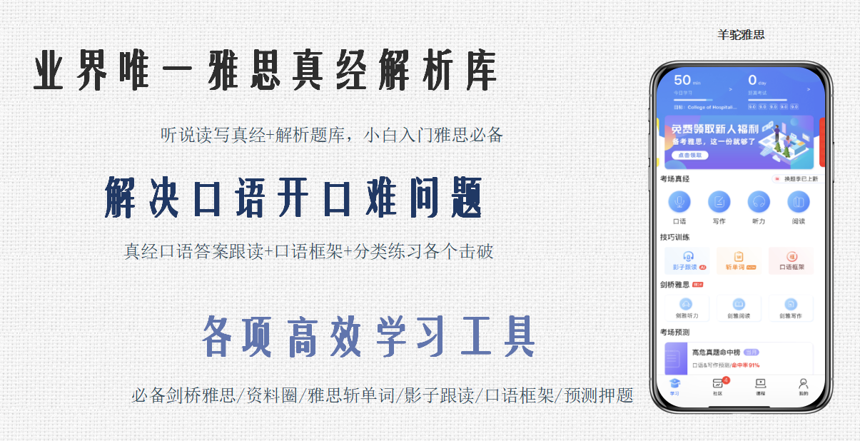 专心事业创新发展。今年4月,APP中大受好评的影子精听跟读跟随版本更新。5月,创造了学员无话可说的口语框架功能,立下了备考口语新方向。羊驼雅思教研组推出的口语框架法,由小到大击破口语难题,从句式开始,逐渐达成一个完整的口语part2。口语一直是中国学生的痛处,为此羊驼雅思专门设立了打卡团,精听跟读模式,支持发音、流利度AI测评指导,真正帮助学员解决口语问题。9月,耗时半年的口语真题跟读出世。