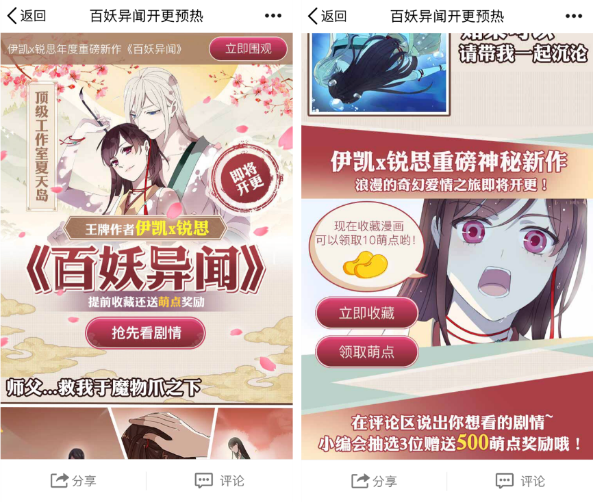 QQ动漫平台强大的推新能力是该作高人气的重要原因。在还未正式上线前,《百妖异闻》已经在QQ动漫平台得到极大的关注。上线前一周,QQ动漫即针对作品策划推出了预告话别,上架一周,预告话别人气即达500万,收藏量达到22万。