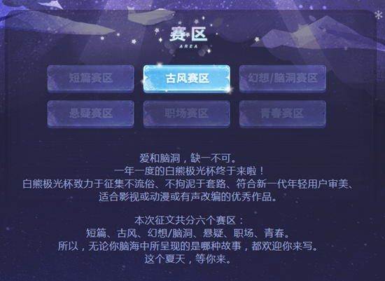 征文共有六大赛区:[短篇]、[古风]、[幻想/脑洞]、[悬疑]、[职场]、[青春]。