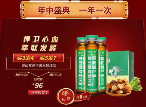 姬松茸芦笋复合菌发酵饮品平日里价格是108元/盒,3送1,5送2;此次618活动价格降到96元/盒,比平时要优惠了12元,还有满10盒送5盒!