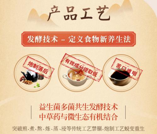 不同的产品采用的是不同的中草药食材,效果作用也自然不同。通过技术将食材成分中的有效物质进行萃取提纯,然后和动物双歧杆菌、鼠李糖乳杆菌、罗伊氏乳杆菌三大益生菌,进行72小时黄金厌氧发酵。发酵后成分中的有效物质含量明显提高,有效成分中的大分子物质经过发酵,转化成小分子物质,更利于人体吸收。在3大益生菌的助力下,能快速调节肠道菌群平衡,加快肠道蠕动速度,使吸收效果加倍。