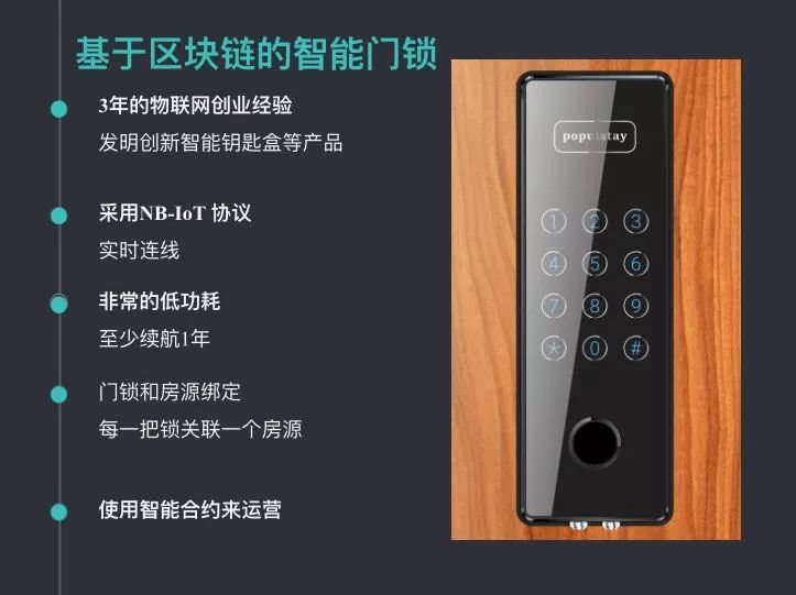 传统的智能门锁都是集中化管理,存在极大的安全隐患。比如某酒店因中心服务器被黑客入侵,导致100多个房间一夜之间被远程打开;某民宿平台智能门锁供应商错误地将新产品线的固件更新推送给另一产品线的产品,导致500个房东受影响,不能修复只能换锁。门锁的痛点恰好是创始人王跃熟悉的领域,PopulStay潮箱设计出了基于区块链的智能门锁,比传统门锁更加安全、智能和高效。这也是潮箱和其他项目的差异化优势。