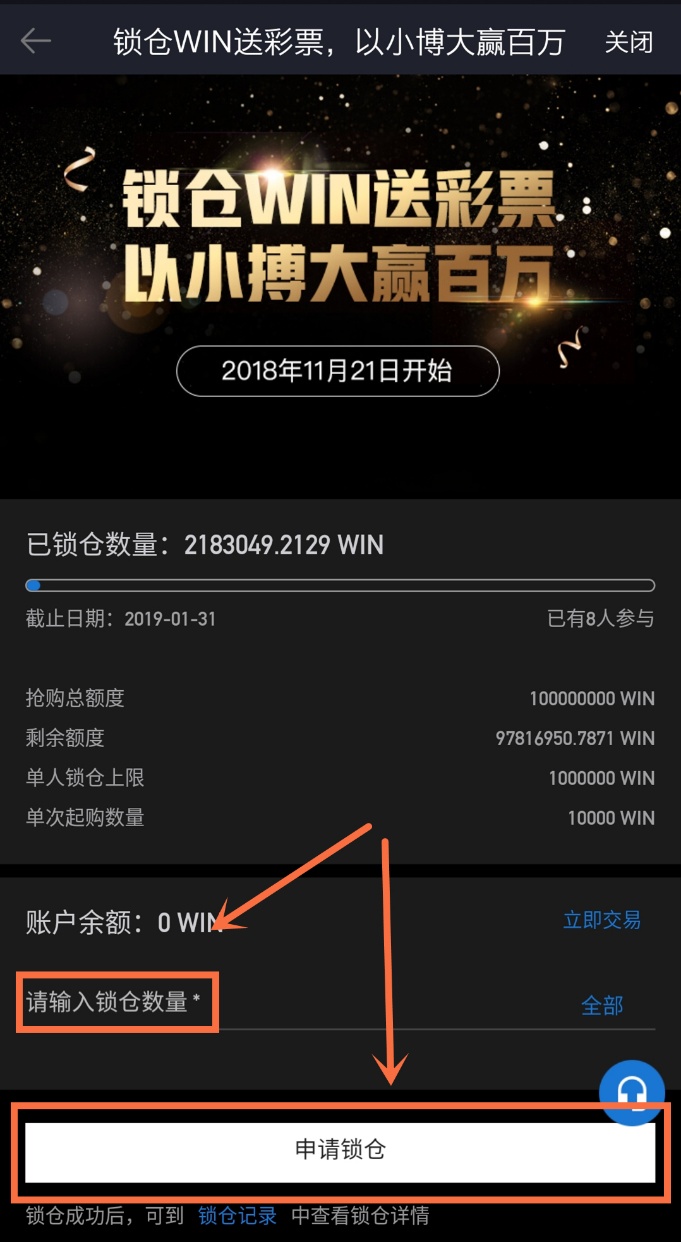 - 输入需要锁仓WIN的数量,点击【申请锁仓】按钮。(注:详细锁仓规则参看页面最下方的“活动规则”)