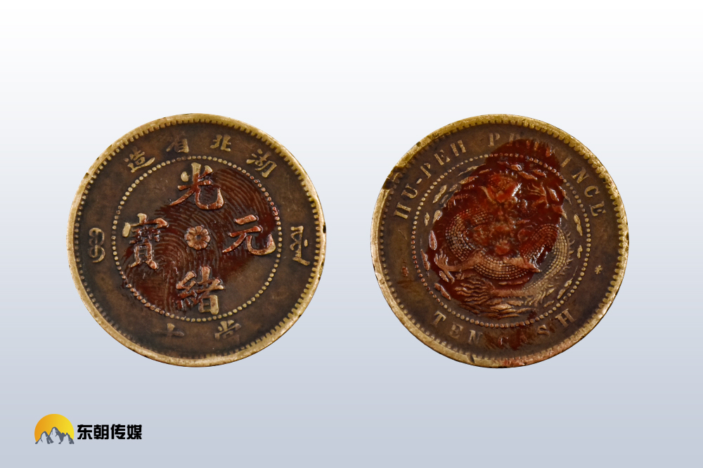 李先生此枚“光绪元宝湖北省造”,正面圈内铸有 “光绪元宝”,珠圈外上环铸“湖北省造”四字,底部铸货币价值“当十”,中心为一朵立体小花。元宝背面内圈铸有神龙腾飞图腾,外圈铸有英文,品相精致,审美风格独特。