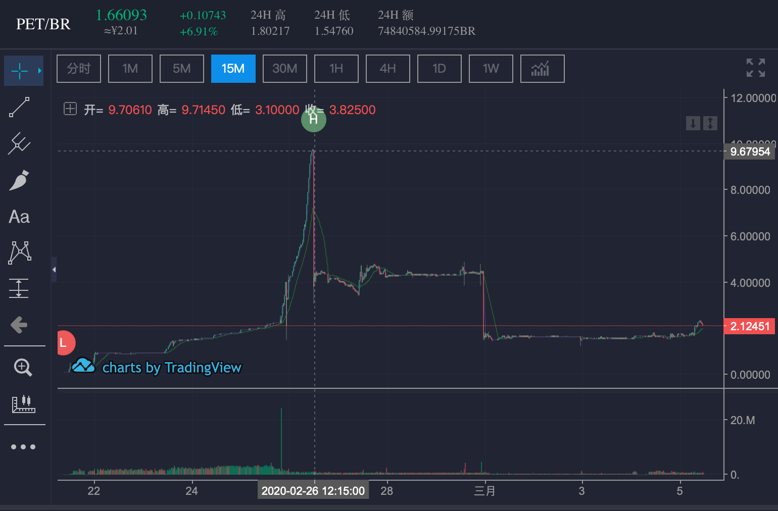2月份,PET宠物链在二级市场上全面推进,2月21日首次登陆币能交易所,凭借扎实的技术支撑和市场运营,PET宠物链得到了投资者的追捧,连续多日上涨,涨幅喜人,从0.1 BR开盘价最高至9.7 BR,涨幅达到惊人的97倍之多,截止目前价格维持2.34 BR附近震荡,相比开盘价也有23倍涨幅,近期碾压圈内所有币种。除此之外,PET宠物链内置PET钱包已经成功开通一键买币功能,法币快速入金,买币更快捷,不通过交易所就可直接进行投资。