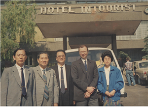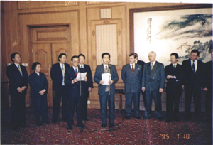 一九九五年元月十八日,中国政府在钓鱼台国宾馆向白俄罗斯政府赠送抗辐射产品——“仙蕺制剂”仪式情景