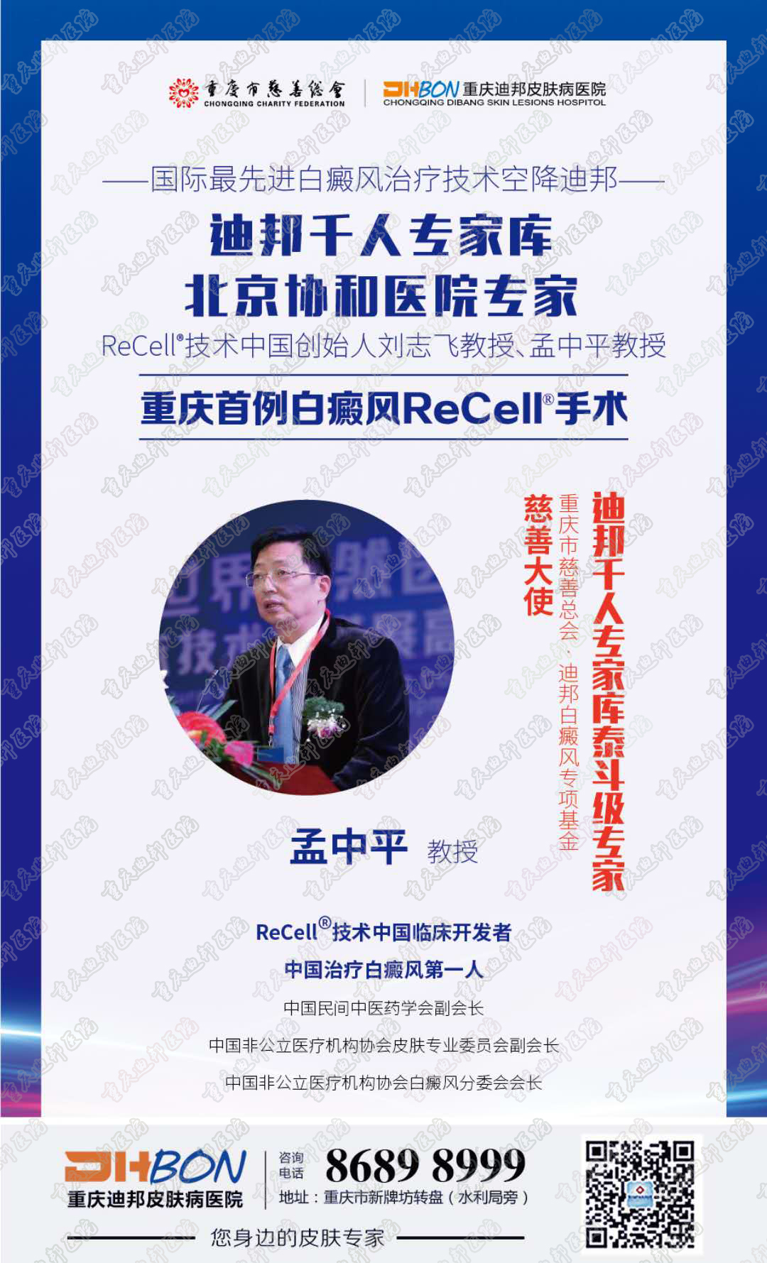 目前,重庆迪邦皮肤病医院首家引进成为ReCell®细胞再生术临床认证基地,也是唯重庆一一家能够进行是ReCell®手术的医疗机构。为进行白癜风公益宣教,重庆市慈善总会联合重庆迪邦皮肤病医院,特别邀请了迪邦医院的千人专家库成员——中国区ReCell®技术创始人、北京协和医院刘志飞教授及团队,中国区ReCell®技术发起人孟中平教授空降重庆亲自进行手术直播,同时为广大白癜风答疑解惑,让更多人了解ReCell®细胞再生术,增强对恢复白癜风的信心,一起对抗“白魔”!