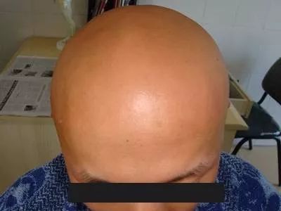 全秃可发生于任何年龄,但以青壮年多见,两性发病率无明显差异。皮损表现为圆形或卵圆形非瘢痕性脱发,头发全部或几乎全部脱落,称为全秃。全身所有的毛发(包括体毛)都脱落,称为普脱。还可见匍行性脱发,病区皮肤除无毛发外,不存在其他异常。