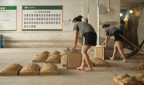 曲料在踩曲女工的脚下翩然成型,成型后的曲块需要短暂的摊凉以蒸发掉多余的水分,故而摆放也有不少的讲究,要横竖对齐,保持相应的间距,等到手摸曲块感觉不沾不黏糊,侧立不变形,便可装车入室,行业称之为“安曲”。除此之外还要经历翻曲、拆曲等一系列的制曲工艺。