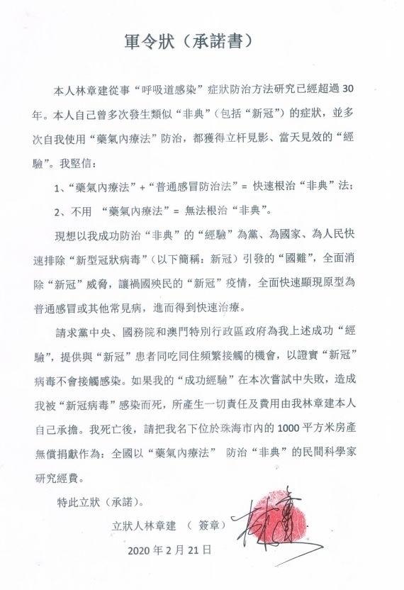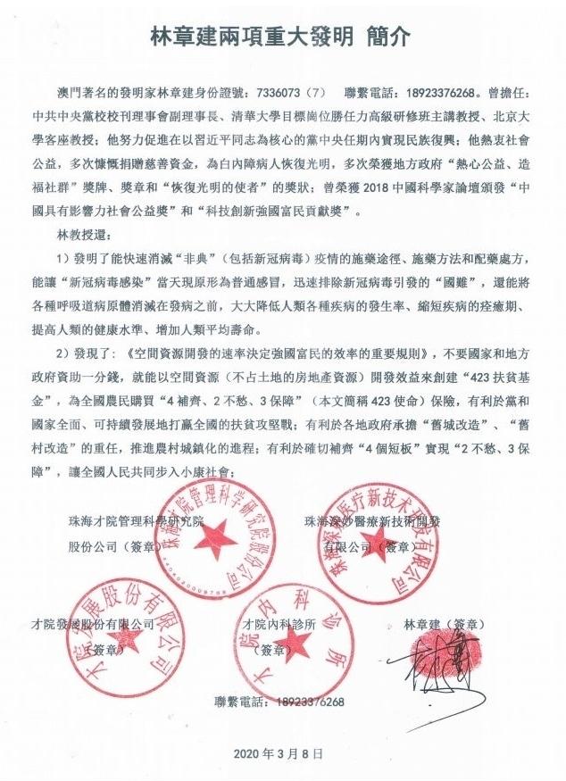 四个公司的董事长林章建先生,今年73岁,澳门永久居民,是个老当益壮不愿退休的民间科学家、发明家和慈善家。他拥护国家“以创新驱动发展”的强国方针和“高手在民间”的伟大思想,30年如一日地完成了“药气内疗法”研究和实践,并于2020年2月19日在珠海中大五院进行了应急的临床试验,反映效果良好,但尚未完成完整的《以药气内疗法防治非典型肺炎临床试验报告》。因此,“药气内疗法”还不敢用于抢救全世界的“非典”患者。