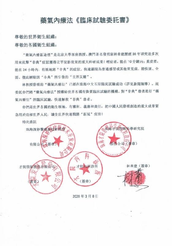因为该《临床试验报告》是检验澳门民间科学家通过30年成功实践的“药气内疗法”能否用于抗击正在肆虐全人类的瘟疫,为了能快速解救全世界已经躺在重症病床的“新冠”患者,为了全面、快速、彻底消除“新冠疫情”,为了防范各种瘟疫卷土重来,敬请批准或推荐全世界有资质进行该临床试验的医疗机构尽快接受委托,紧急进行《药气内疗法的临床试验报告》。该临床试验的经费全部由“药气内疗法”的发明人及其名下的四个企业全力捐助。