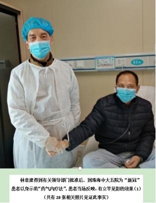 2020年2月19日9点,受珠海卫生健康局领导和中大五院领导的共同安排,北京大学客座教授林章建到珠海中大五院传染区为两个“新冠”患者以身示范“药气内疗法”防治“新冠”(有现场照片共28张为证)。
