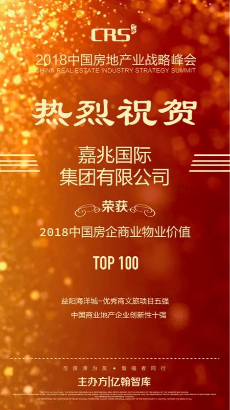 嘉兆国际荣获“2018中国房企商业物业价值TOP100”奖项