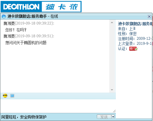 进入迪卡侬的天猫旗舰店寻找客服发现,迪卡侬采用的是服务助手机器人,不能针对性地回复客户的问题,很多问题都是答非所问。产品出现问题的时候,需要花很多时间和精力才能找到售后,非常麻烦。
