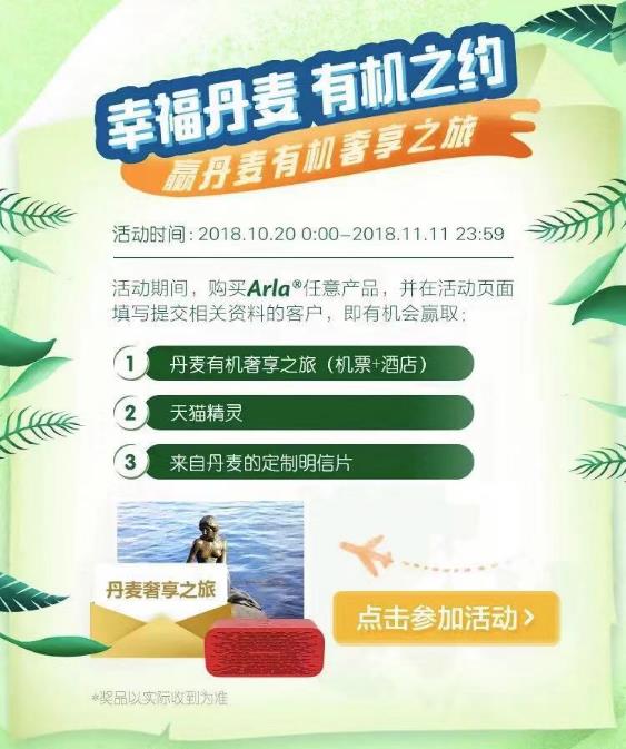 更有机会变身首席有机体验官,免费体验独家定制的丹麦有机奢享之旅!活动期间,购买Arla任意产品,并在活动页面提交相关资料即有机会免费赢取丹麦有机奢享之旅(机票+酒店),还有天猫精灵、来自丹麦的定制明信片等专属好礼等着你~