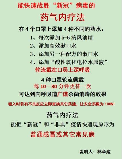普通口罩只可以“防病”,不可以“治病”。本公司的董事长林章建发明的“药气发生装置”,专利号:ZL201220034103.6,是在口罩上添加可挥发性药物,通过人体的呼吸气流把“药气”输送到人体的呼吸道粘膜各个部位,既可以高效预防各种“传染病”,又可以快速根治各种“传染病”。因为,佩戴带药的口罩(即使用“药气内疗法”)可以先把潜伏在每个人呼吸道粘膜最表层之上的“病原体”消灭,避免患者把“病原体”呼出到大自然的空气中引发传染,所以,其“隔离”效果,大大强于以建筑物“住宿墙”对患者进行“隔离”的效果。使用“带药的口罩”后,既可与“非典”或“新冠”患者同吃、同住、同生活、同生产、同劳动,又不会受到该患者病毒的感染而影响各行各业的生产和劳动,还可以在24小时之内,让“非典或新冠”患者显现原型为“普通感冒和其它常见病”。 只有这样的防病治病功能和效果,才能快速解救已经躺在重症病床上的“非典”(包括“新冠”)患者,才能全面消灭正在席卷全球的“新冠”疫情,才能让全国人民在各行各业专心致志地工作,才能成就伟大的中华民族承担“大国的责任与担当”。十七年全面、深入、广泛的研究和实践已经充分证明:使用各种疫苗、针剂和口服药防治“非典”(包括“新冠”)疫情,都不可能达到使用“药气内疗法”同样功能和效果!