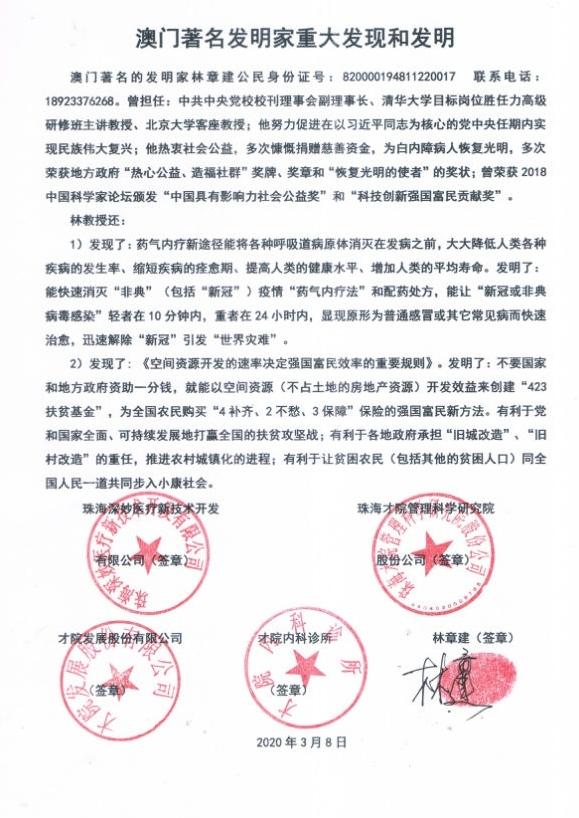 我们四个公司的董事长林章建先生,今年73岁,澳门永久居民,是个老当益壮不愿退休的民间科学家、发明家和慈善家。他拥护国家“以创新驱动发展”的强国方针和“高手在民间”的伟大思想,30年如一日地完成了“药气内疗法”研究和实践,并于2020年2月19日在珠海中大五院进行了应急的临床试验,反映效果良好,但尚未完成完整的《以药气内疗法防治非典型肺炎临床试验报告》。因此,“药气內疗法”还不敢用于抢救全世界的“非典”患者。