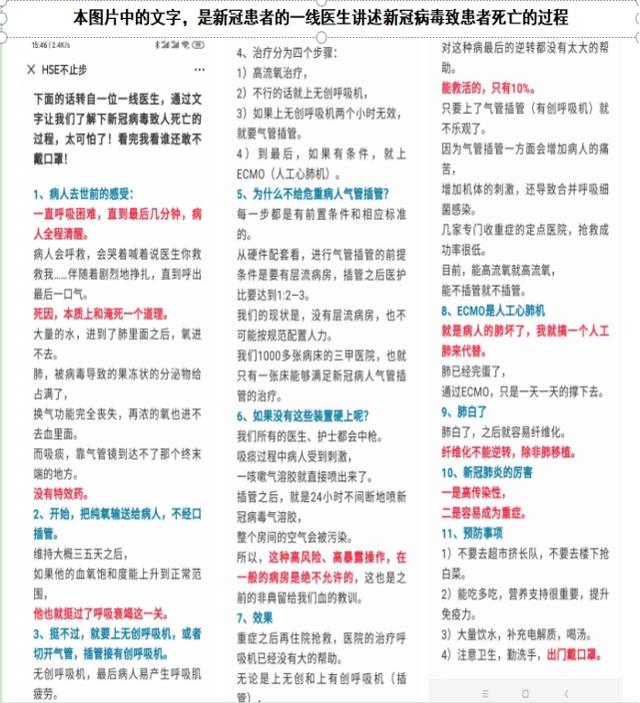 细读下图《新冠患者的一线医生讲述新冠病毒致患者死亡的经过》后发现:“新冠”医生所述的治疗过程,始终没有使用到“药气内疗法”为患者消灭已经潜伏在患者呼吸道粘膜最表层之上的病原体,所以患者治疗的时间长、治疗成本高,而且“新冠”患者的肺粘膜才会被“果冻状的分泌物沾满了,无法呼吸到新鲜的氧气而致命死亡”。