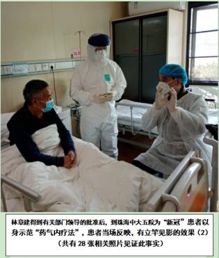 2020年2月19日9点,受珠海卫生健康局领导和中大五院领导的共同安排,北京大学客座教授林章建到珠海中大五院传染区为两个“新冠”患者以身示范“药气内疗法”防治“新冠”(有现场照片共28张为证)。