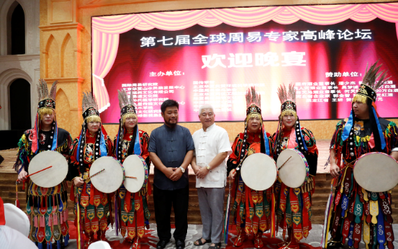 (华夏易道文化院院长宋国元与萨满文化舞蹈团合影)