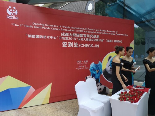 2018年8月17日,成都大熊猫繁育研究基地开启“熊猫国际艺术中心”开馆暨2018“天府大熊猫文化研讨会”(首届)仪式。首位与成都大熊猫繁育基地合作的四川旅游文创手信品牌“Panda Q”董事长王兴祥携CEO付红妍、副总经理李林灿受邀参加(从右至左)。