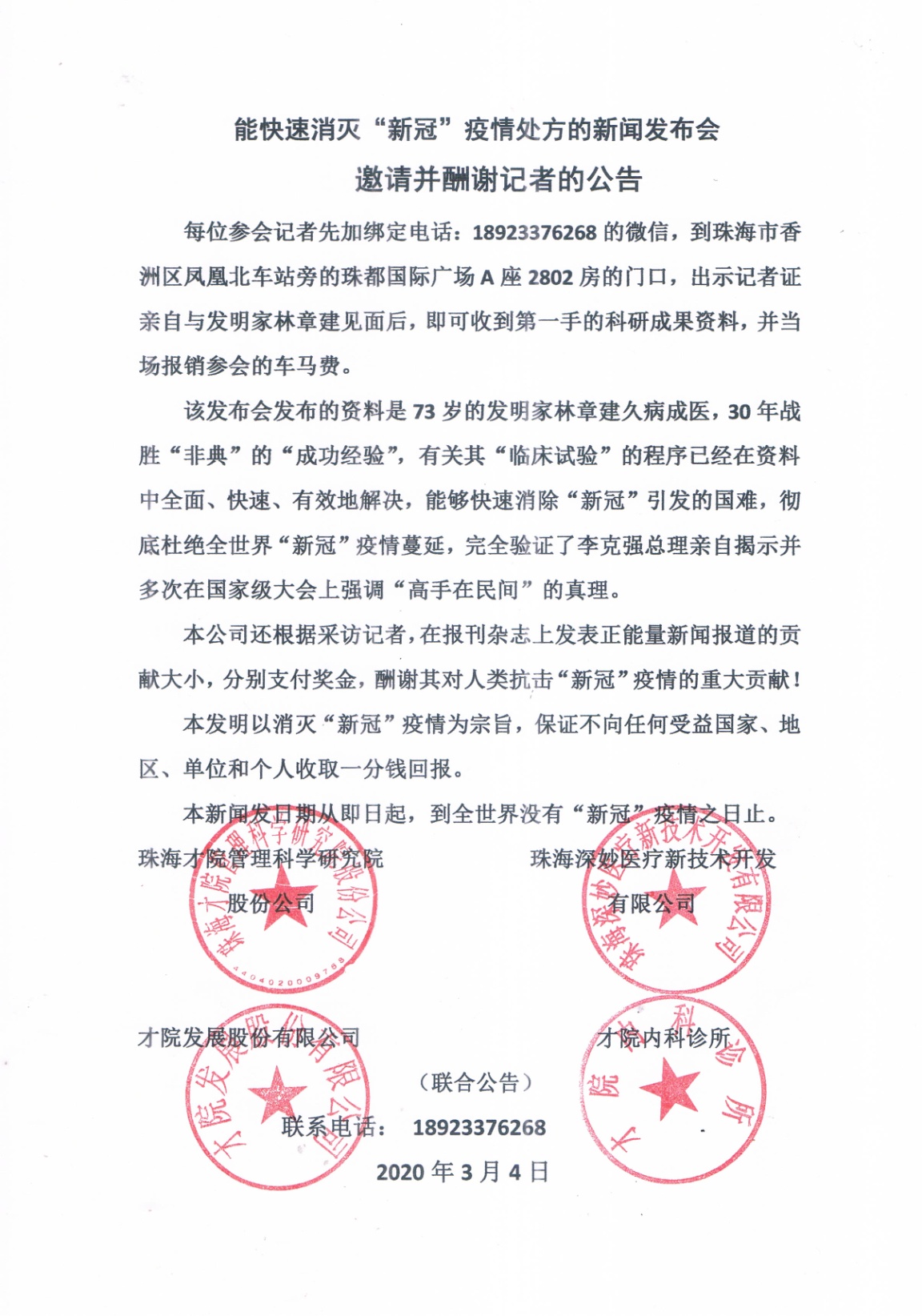 记者先加绑定电话:18923376268的微信,到珠海市香洲区每位参会凤凰北车站旁的珠都国际广场A座2802房的门口,出示记者证亲自与发明家林章建见面后,即可收到第一手的科研成果资料,并当场报销参会的车马费。