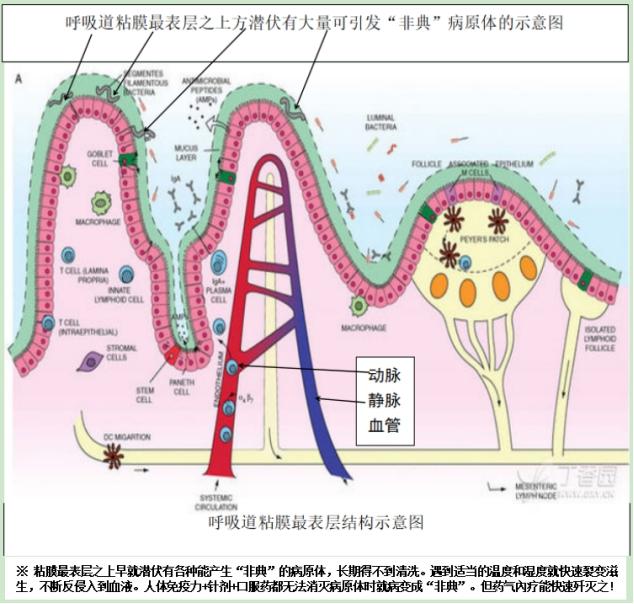 抗而爆发“非典”,绝非单一的“新冠”病毒所引发“非典”。因此,任何“新冠”疫苗、针剂、口服药对该类严重的“非典”患者均无根治的可能!因为疫苗、针剂、口服药只能消灭已经进入血液的病原体,不能消灭还没有进入血液并且始终潜伏在呼吸道粘膜最表层之上病原体。这好像春季霉雨天的棉被容易发霉而滋生大量的细菌病毒的原理一样。大量的细菌病毒把棉被微细的通气孔都堵死了,所以整床棉被(呼吸道粘膜)就像涂上了一层“果冻状的分泌物”不能透气,而把患者憋死了)。这种症状,只要用《药气內疗法》先把潜伏在呼吸道粘膜最表面之上的多种病原体消灭(这和用花露水直接喷洒棉被上的病原体一样),棉被上的细菌病毒繁殖裂变的速率立即被抑制,棉被上的通气孔就不会被全部堵死。