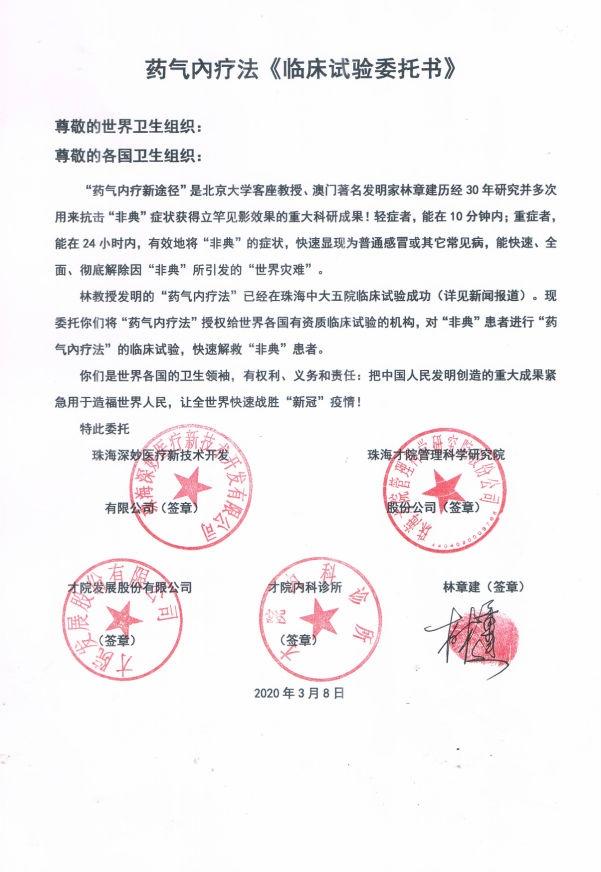 我们四个公司的董事长林章建先生,今年73岁,澳门永久居民,是个老当益壮不愿退休的民间科学家、发明家和慈善家。他拥护国家“以创新驱动发展”的强国方针和“高手在民间”的伟大思想,30年如一日地完成了“药气内疗法”研究和实践,并于2020年2月19日在珠海中大五院进行了应急的临床试验,反映效果良好,但尚未完成完整的《以药气内疗法防治非典型肺炎临床试验报告》。因此,“药气內疗法”还不敢用于抢救全世界的“非典”患者。