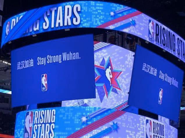 在芝加哥全明星新秀赛现场, NBA将 “武汉,加油” 的中文元素,多次呈现在赛场内和转播画面中,为中国人民抗击新冠肺炎疫情加油打气。现场大屏幕播出“武汉加油”的口号。中国球迷观赏的赛事直播中也加入虚拟场边广告,声援武汉。“我们心连心,团结力量一起为武汉加油,为中国加油!”这也是NBA 历史首次通过全明星周末赛事,在赛场内外向全世界发出支援中国抗击疫情的 “声音” 。