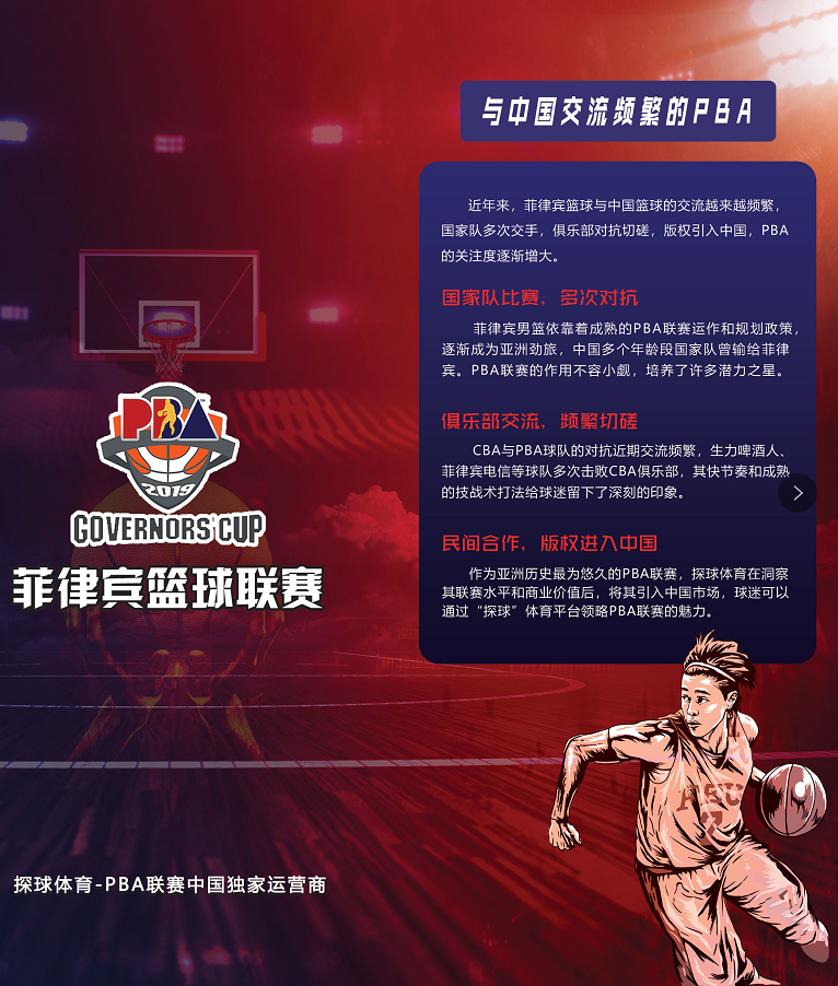 2019年6月,探球网斥资拿下PBA版权,成为菲律宾篮球联赛中国独家推广方。