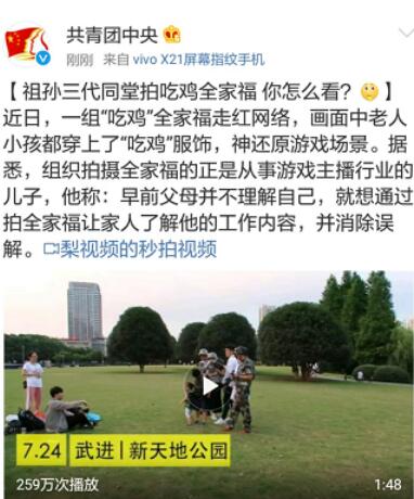 (花花拍摄吃鸡全家福被数十家媒体争相报道,共青团扩散报道)