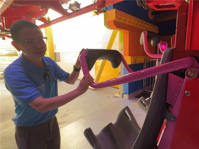 倪向旭用力按压安全压杆,确保其能够牢固地固定住游客。图/俞金旻摄