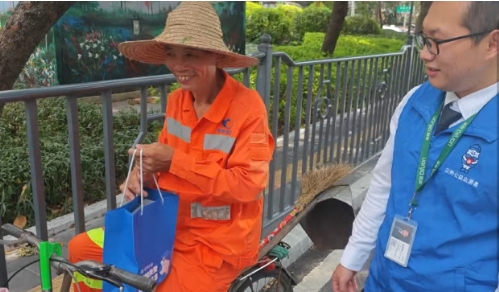 环卫工师傅刚把一车落叶倒进垃圾车内,脸上已大汗淋漓。“大哥,歇口气!”志愿者、链家经纪人廖雯潮递上清凉物资,师傅愣了半秒,急忙接过,连说三声“谢谢”。
