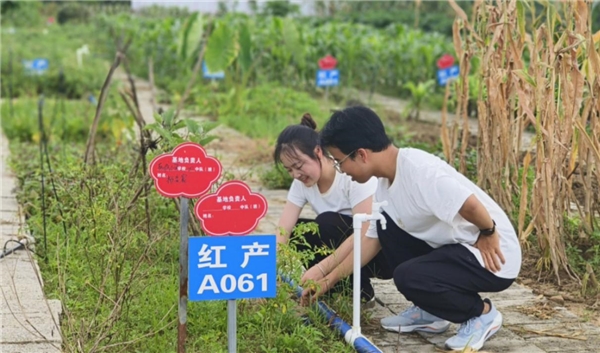 车辆在平坦的道路上驰骋,随即映入眼帘的是一排排整齐的楼房。团队意识到第一站---红产垌到了。下车后,红产垌里一排排整齐的楼房,一条条整洁的小道,一个个完善的基本设施令人敬佩,一定是村民们通过自己勤劳双手才能换来如今的景象,这也离不开村组织们的领导。紧接着泗民村党支部的吴世章书记和泗民村妇联的邓碧云主席向团队介绍泗民村当前基本情况,并带团队走向种植研学基地去感受。在种植研学基地内,种植着当地各中小学学生们亲自种植的植物,一块块田地里竖立的责任牌有着孩子们稚嫩的汉字。他们像农民伯伯一样种植粮食作物,想必在劳作之中他们也会学会劳动的意义,使他们受到影响做一个更好的人,也更能体会到“谁知盘中餐,粒粒皆辛苦。”的道理。吴书记说:“村里设置的种植基地,不仅促进着学生与社会的联系,而且也促进着乡村的发展。”是啊,两者之间都得到了发展,这样的变化是相互促进的!在这样的感受下,实践队员们也受到影响深入种植基地中,每个人都在去除田地生长出来的杂草。除去田里的杂草,不单是知道了在田间地头中感悟到了劳作的快乐,也更希望在以后的收成中,作物都能获得好的丰收,让学生们都可以体验到收获的快乐。