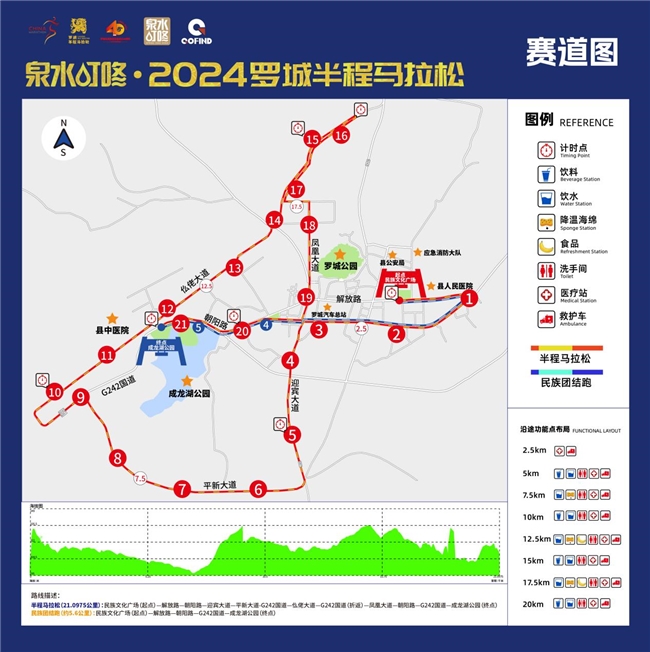 今年的比赛路线规划相较去年,体验感、舒适度都有所升级。减少了坡数以及长度,一路平缓少坡。选手们将从民族文化广场出发、途径解放路、朝阳路、迎宾大道、凤凰大道等路段,最终到达成龙湖公园。本次赛道在极大的保留了罗城独特的自然的风景的同时,也将罗城的仫佬族文化特色最直观地展现在大众视野中,让选手们既可以欣赏“三尖罗城”的山水之美,也能尽览“千年仫佬”的民族风情。