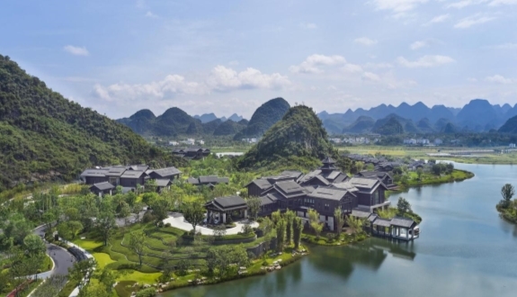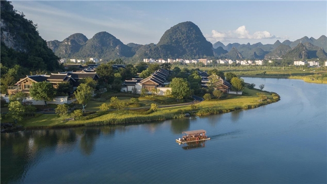 如宝石般镶嵌于桂林漓江之畔的桂林雁山宋品酒店,巧妙利用地势地貌,将建筑隐于山水林峰之间,让山林与江面遥相呼应,亭台楼阁,峰峦迭起,展现出中国传统园林的精髓。