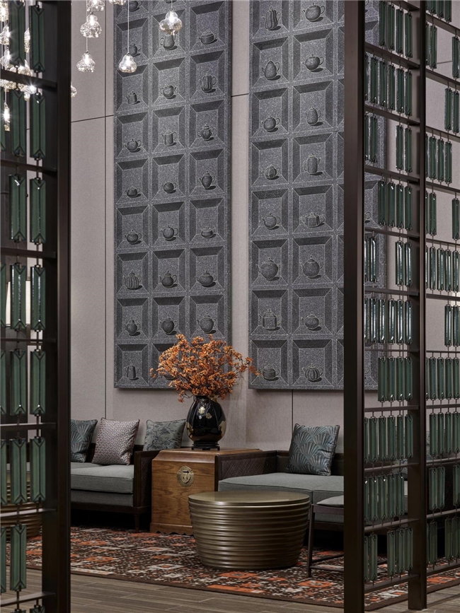 桂林雁山宋品酒店顺应自然条件,取样在地民族文化精髓,建筑设计巧妙采样侗族建筑与桂北民居建筑特色,以侗族标志性特色建筑元素“五重檐”、“斗型塔”、“黑瓦白檐”为灵感,构建了一处远离喧嚣的静谧空间,酒店大堂则以现代建筑手法再现了少数民族地区干阑式建筑的结构特点,并以侗锦纹样的屏风将空间划分,细节之处辅以特色吊灯及山水根雕装饰,展现出少数民族的人文气息。