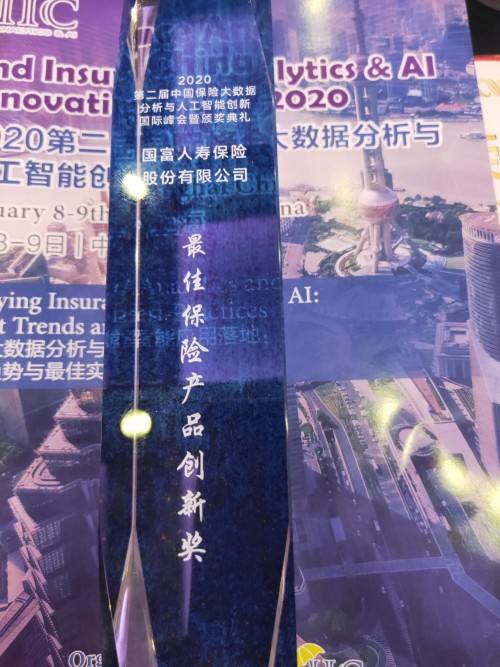 2019年1月8日,2020第二届中国保险大数据分析与人工智能创新国际峰会在上海开幕。在峰会的颁奖典礼上,国富人寿“定海柱1号”产品获得大会颁发的“最佳保险产品创新奖”。