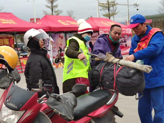 此外,新老“姜汤哥”从早到晚坚守在加油站服务返乡旅客,每到夜幕降临,眼看着摩托车返乡务工人员的驾驶视线愈加模糊,他两便齐上阵一人拿反光条、一人拿剪刀,熟练配合将反光条贴在每一辆摩托车上,并叮嘱他们务必安全骑行、平安回家。(周慧卓)