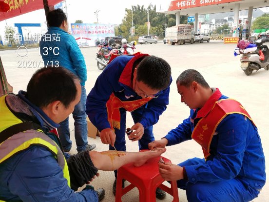 杨师傅三人拖车疲惫不堪的身体走进加油站稍作休息,情暖驿站志愿者给他们端来姜汤的间隙发现三人均有外伤,迅速应急药箱并喊上其他同事,手法娴熟的给杨师傅三人消毒、巴扎伤口。