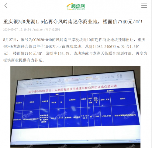 2020年5月27日,银河龙湖以约1.5亿成功竞得凤岭滨江GC2020-040地块,天街购物中心扩容,城市新中心再升级。
