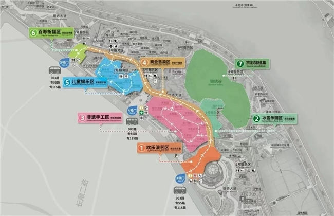 本次“京彩嘉年华”自1月22日正式开园,共规划出“京彩欢乐集”“京彩瑞雪集”“京彩千福集”“京彩新禧集”“京彩贺岁集”“京彩百寿集”“京彩锦绣集”七大主题区,分为“京彩年货节”“京彩大庙会”“京彩花灯集”和“京彩国风季”四个周期,以充分满足新春佳节期间不同阶段、不同客群的多样化需求。