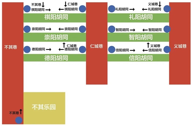 市内 700 多个摊位,因缺少地标,存在狭窄拥挤、指示不明的情况,此次焕新中,以南北向主干道为“城”,东西道为“阳”,并结合“祺”“崇”“德”“仁义礼智信”等寓意,对吕家庄夜市的近 20 条道路街巷进行系统的命名,并规范设计和安装了道路牌——南北由不其(fuji)巷、仁城巷、义城巷三巷,东西由祺阳、崇阳、德阳、仁阳、义阳、礼阳、智阳、信阳八胡同将夜市坐标重塑。