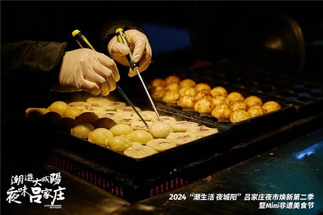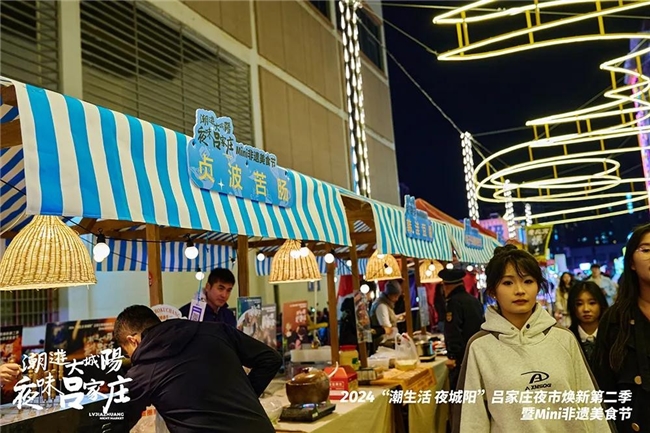 吕家庄夜市的频频出圈,与城阳区建设胶东经济圈消费中心的发展理念,唱响“潮生活 夜城阳”消费城市品牌的快车以及营商环境的优化密不可分。此次焕新活动中,在青岛市城阳区文化和旅游局、青岛市城阳区商务局的大力协助下,集合了贞波苦肠、美联升花饽饽传统制作技艺、兔子头酱焖技艺、韩洼豆腐、海鲜传统腌制技艺、周氏流亭猪蹄制作技艺、源华肉制品制作技艺、流亭焖肉传统制作技艺、王氏脂渣传统制作技艺、洼里大包制作技艺等 10 余家城阳非遗品牌美食组成“Mini 非遗美食节”,既是对城阳区深厚“食文化”底蕴的展示,也丰富了吕家庄夜市的美食品类,亦是现代与传统于烟火领域的一场跨时空对话。