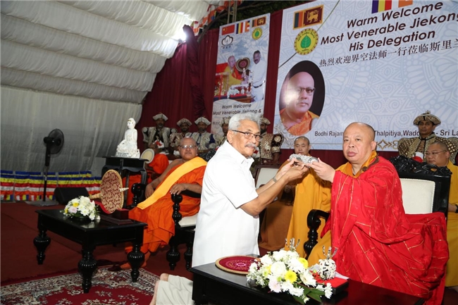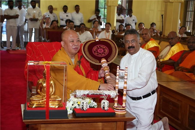 庆典期间,斯里兰卡佛教暹罗派科提部僧王、斯里贾亚瓦德纳普拉大学校长Ittepana Dhammalankara大长老在55位部派长老的见证下,授予界空法师“中斯佛教交流友好使者”荣誉称号,以表彰其在推动中斯佛教友好交流中的杰出贡献。斯里兰卡最高法院首席大法官Jayantha Jayasuriya夫妇亲临庆典现场,并为界空法师赠送象征尊荣的圣扇,进一步彰显两国在佛教文化传承与友好合作上的深厚情谊。