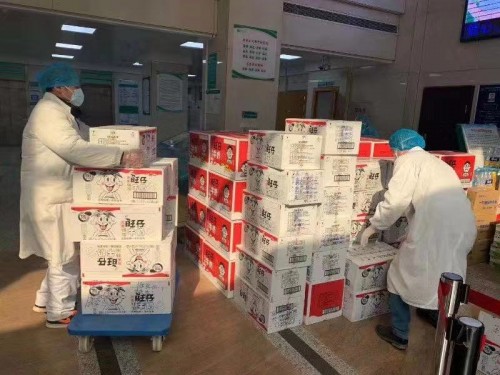图1:武汉市第三医院新冠肺炎防控物理管理办公室搬运旺旺集团捐赠旺旺食品
